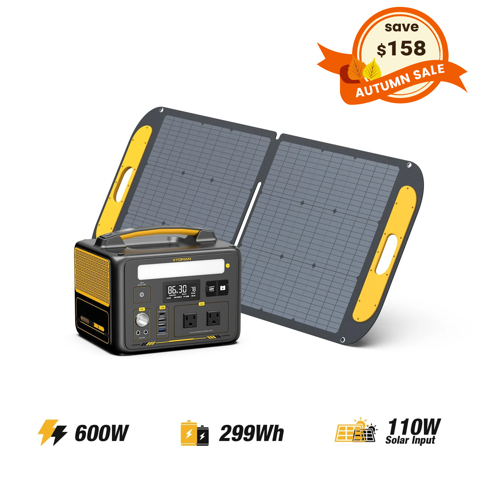 Jump 600X lifepo4 power station features a DC input port(specification:5.5mm*2.1mm) with a max input power of 110 Watts. When charging with VTOMAN 110W solar panel, it can be fully recharged within 3.5-4.5 hours. (The actual charging time depends on sunlight intensity.)